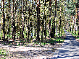 Wenn man dem Radweg folgt, führt der Radweg in ein Senke hinein. Hier befindet sich links ein Sandweg zum Herzberger See.
